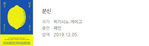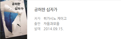 히가시노 게이고에게 매력을 느끼게 해준 책으로아직까지도 내용이 기억날 만큼흥미롭게 읽었던 책입니다.